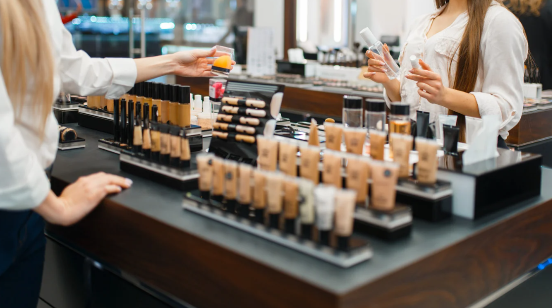 Rotating countertop displays and wall-mounted shelves maximize premium space and appeal without distracting from the products themselves.